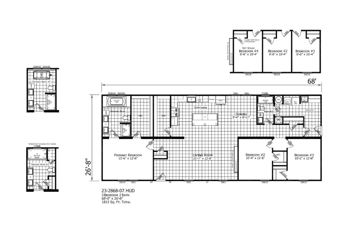 The Ironclad / 2868-07 built by Champion Homes offers 1813 square feet of thoughtfully designed living space, featuring 3 bedrooms and 2 bathrooms. The spacious layout includes a welcoming living area, a well-equipped kitchen with ample counter space, and a comfortable primary suite with a private bath. Additional bedrooms provide flexibility for guests or a home office. The 2868 blends functionality and comfort, making it a great choice for modern living.